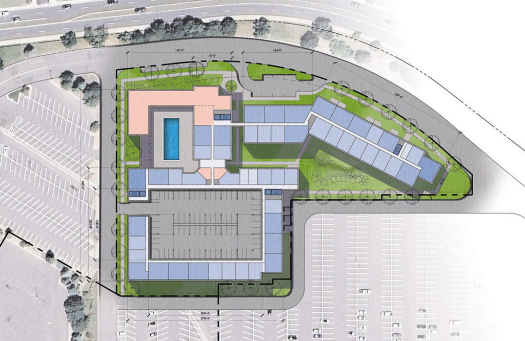 This multifamily, two-phase wrap is currently planned to reclaim 4 acres of blighted asphalt in the Northwest corner of the Southwest Plaza shopping mall. This design takes advantage of the beautiful mountain views and great solar access to the outdoor pool deck and amenity wing. When complete, this site will add nearly .75 acres of water quality through the various landscaped zones, providing relief from the heat island effect and excessive stormwater runoff.
